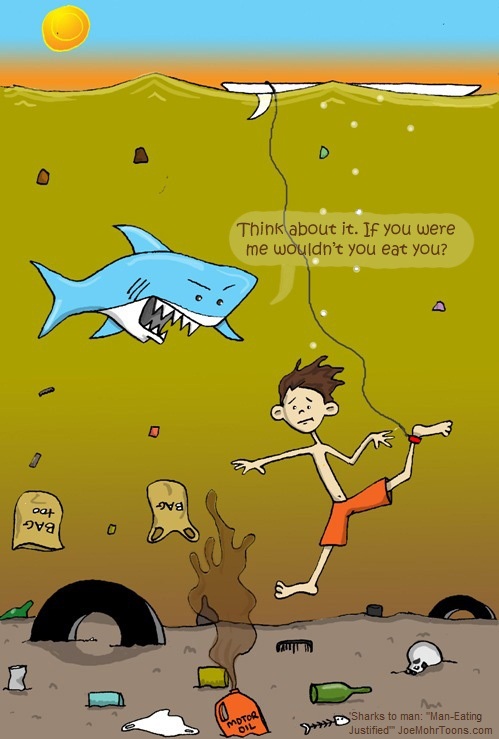 Whether we blow ’em up or defile their home you can see why a shark might decide man is a worthy snack.