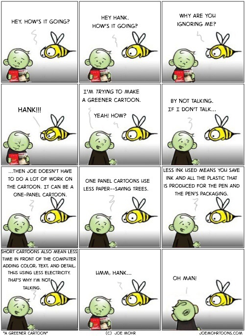 Follow the rest of the Hank D and the Bee series at JoeMohrToons.com. For cartoon updates and other green goings-on, follow Joe on Twitter @GreenCartoons.