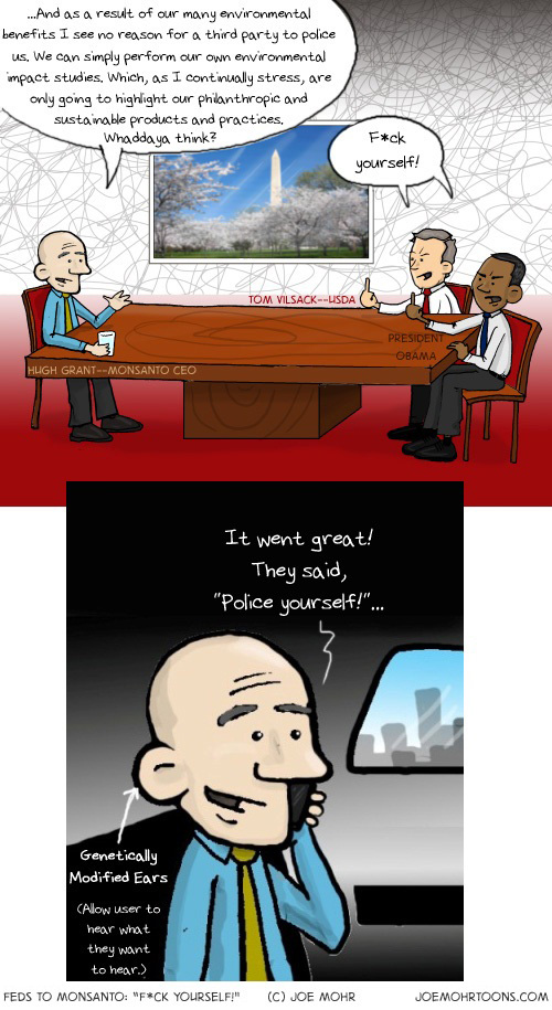 Read Tom Philpott’s article on Grist, for more information on Monsanto’s latest victory: USDA moves to let Monsanto perform its own environmental impact studies on GMOs