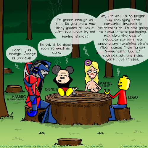 As illustrated (pun!) in the cartoon, of the four major toy (etc) companies, only Lego has announced plans to mend their ways. For info on their intentions, as well as their misdeeds and those of the other three companies, check out Daniel Brindis’s post on the Greenpeace blog, Lego Takes Action to Tackle Deforestation.