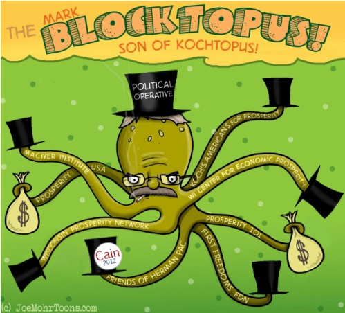 If you are unfamiliar with Mark “cigarette puff” Block and his shady relationship with the Koch brothers and Herman Cain watch this video of Lisa Graves on MSNBC’s The Last Word, and read this article from the Center for Media and Democracy: CMD’s Quick Guide to the Mark Block “Blocktopus”