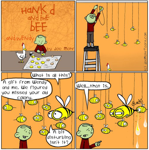Long time “hankheads” may recognize this as an old Hank D and the Bee cartoon. However, it is a bit different–I made it mildly more disturbing, and added Wendy to the strip.