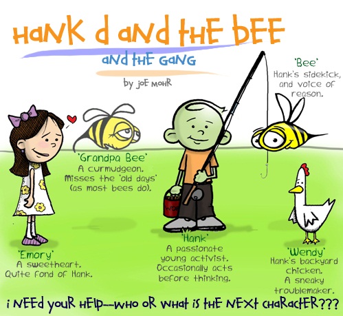 Hey Hankheads! I need your help. Can you suggest a new character for Hank D and the Bee? It can be an animal, a person, an insect, or anything your creative little brains come up with! Just leave your suggestions in the comment section of this cartoon, or (if you’re reading this on NaturalPapa, EcoChildsPlay, or EcoSnobberySucks) on my cartoon archive website.