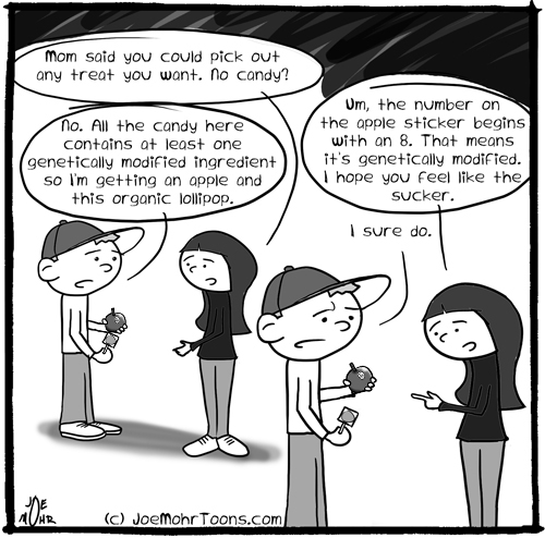 I don’t think the GE apple (“Arctic Apple”) is on the market currently, but it has been in testing since 2003. But, the cartoon is more saying nothing is safe. If it’s not GE now it can be someday…Sad but true.