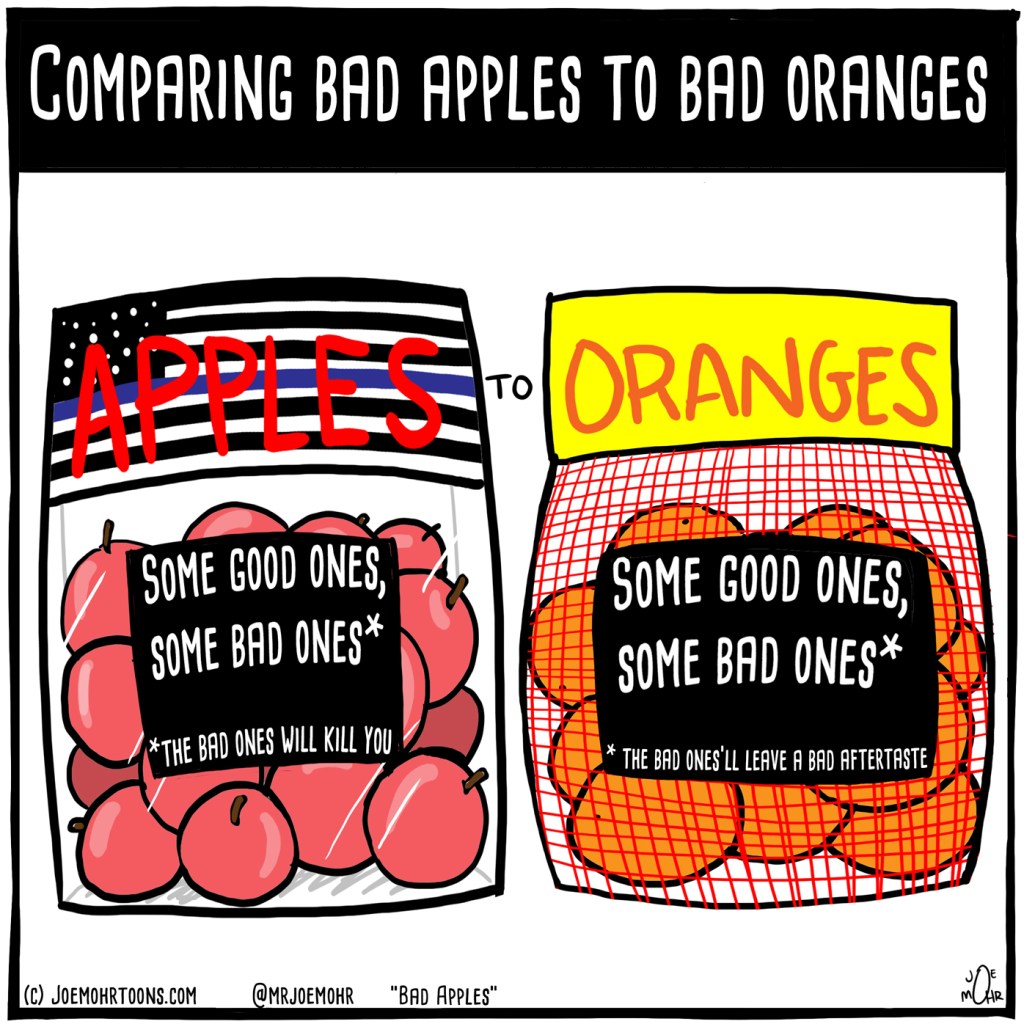 May 17, 2021 (Bad) Apples to Oranges I’m so tired of this defense of bad cops: “But there are bad people in every profession.” Apples to oranges.Joe’s on instagram and twitter @mrjoemohr Make someone laugh (or make someone else angry). Share this cartoon! Click to share on X (Opens in new window) X Click to share on Facebook (Opens in new window) Facebook Click to share on LinkedIn (Opens in new window) LinkedIn Click to email a link to a friend (Opens in new window) Email Click to share on Reddit (Opens in new window) Reddit Click to share on Tumblr (Opens in new window) Tumblr Click to share on WhatsApp (Opens in new window) WhatsApp Click to print (Opens in new window) Print Click to share on Pinterest (Opens in new window) Pinterest Click to share on Threads (Opens in new window) Threads More Click to share on Pocket (Opens in new window) Pocket Click to share on Telegram (Opens in new window) Telegram Like Loading... Published by Joe Mohr Syndicated cartoonist since 2007, author, illustrator, lyricist, dad, hubby, bald. View all posts by Joe Mohr
