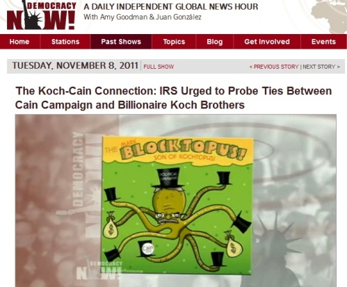 * From Democracy Now: My Mark Block/Hermain Cain “Blocktopus” cartoon (about 55 minutes into the show during the interview with Center for Media and Democracy’s Lisa Graves).